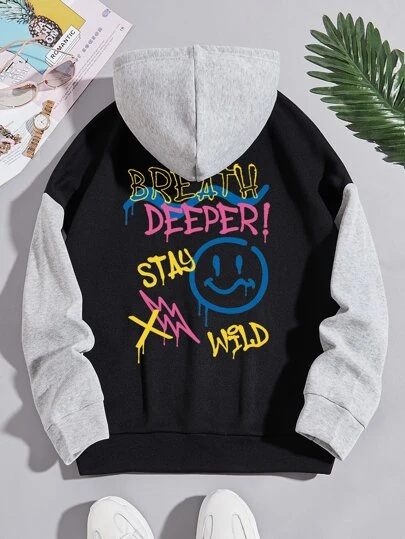 Two Tone Expression & Letter Graphic Kangaroo Pocket Drawstring Hoodie - Black - View 1