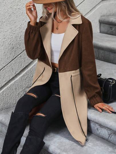 SHEIN Clasi Two Tone Lapel Neck Flap Detail Tweed Overcoat - Coffee Brown - View 1