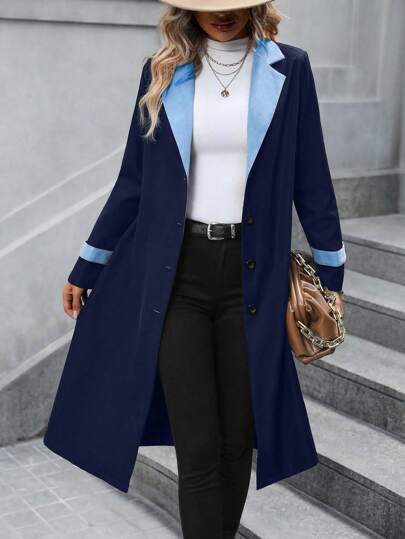 EMERY ROSE Two Tone Lapel Neck Single Breasted Trench Coat - Navy Blue - View 1