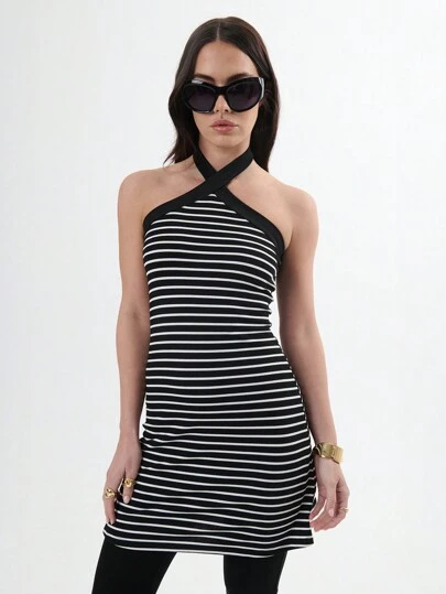 TypaGal Basic Contrast Stripe Halter Neck Mini Dress - Black and White - View 1