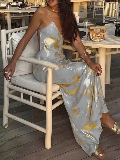 UREREM Women's Summer New Arrival Metallic Backless V-Neck Fashion Elegant Versatile Dress, Suitable For Dates, Outings, Vacations, Weddings, Parties, Carnivals, Easter, Music Festivals, Oktoberfest. Woven Fabric 110G, Sexy Style Metallic Dress - Light Grey - View 1