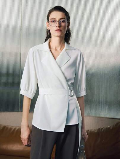 Uhlyne Women's Fashion Simple Turndown Collar Metal Detail Mid-Sleeve Casual Blouse,White Light Weight Blazer Shirt,Easy Care,Little Strech,Autumn,Minimalist,Work Wear,Teacher Outfits,Back To School,Fall ,Neutral Clothes,Business Casual,Old Money Style All White - White - View 6