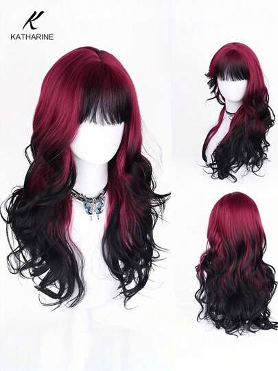 26" Glamorous Wavy Curly Long Hair Wigs - Synthetic Women Black Red Highlights Cosplay Daily Party Clothing Wig Halloween Party(Excluding Accessories) - Red Highlight - View 1