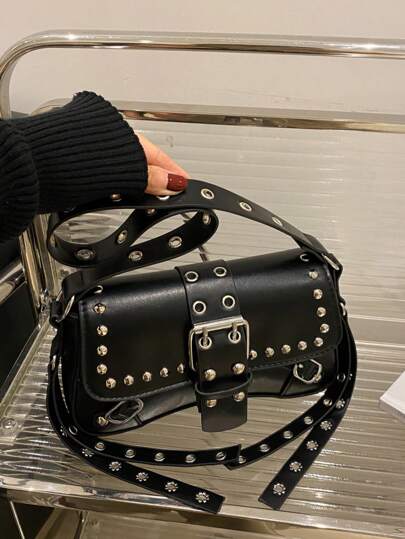 Fashionable Solid Color Rivet Decoration Armpit Foreskin Buckle Flip Shoulder Bag, Suitable For Shopping, Wallets, Shopping, Young Women, College Students, Newcomers, White-Collar Workers. They Are Very Suitable For Offices, Universities, Work, Business, Commuting, Outdoor Activities, Travel, And Outings - Black - View 1