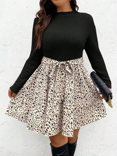 SHEIN Frenchy Women's Plus Size Floral Print Belted Dress - Black - View 1