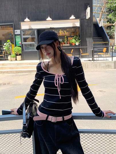 Unique Striped T-Shirt, Flattering Fitted Top, Fashionable For Early Autumn - Black - View 5
