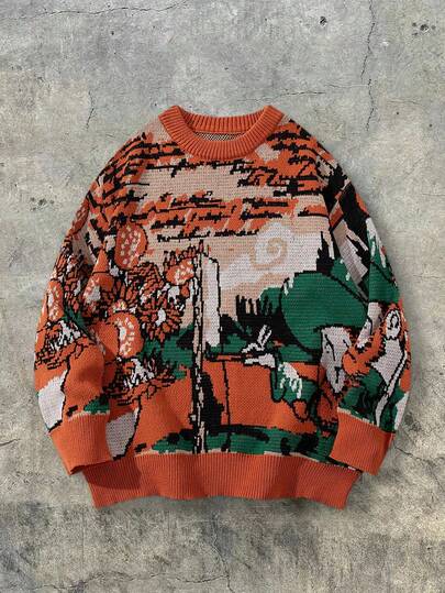 Unisex Casual Loose Fit Crew Neck Pullover Sweater With Interesting Cartoon, Abstract, Van Gogh Painting Patterns, Suitable For Autumn/Winter - Orange - View 1