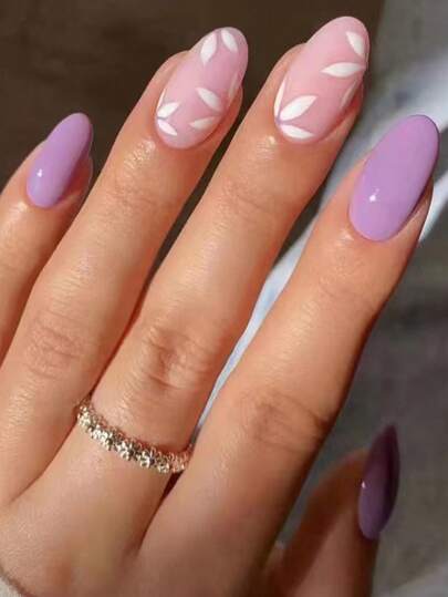 Upgrade Your Look With 24pcs Lilac Long Oval Leaf Pattern Glossy Finish Full Cover Fake Nail Kit - Mauve Purple - View 1
