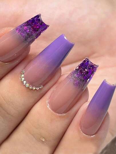 Upgrade Your Look with 24pcs Long Coffin Purple Gradient Glitter 3D Rhinestone Decor Fake Nail & 1sheet Tape & 1pc Nail File - Multicolor - View 1