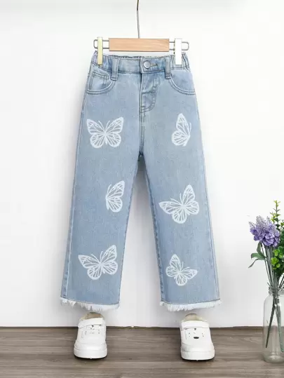 Young Girl Butterfly Print Raw Hem Straight Leg Jeans,Holiday,Summer,Travel - Light Wash - View 1