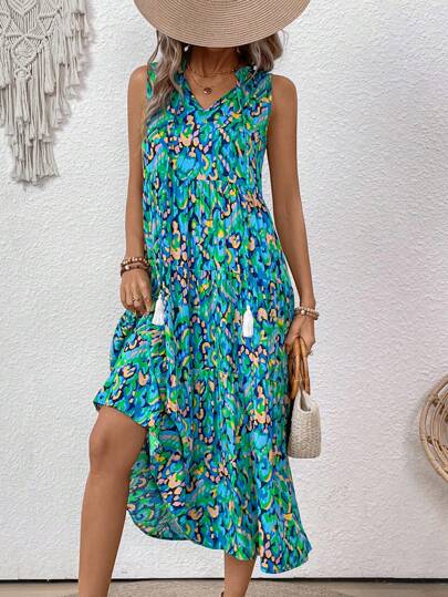 Breezaya V-Neck Full Printed Loose Sleeveless Dress With Fringe & Ruffle Trim Maxi Vacation Beach Outfits Women - Navy Blue - View 1