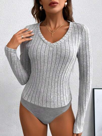 SHEIN LUNE V Neck Ribbed Knit Bodysuit - Grey - View 1