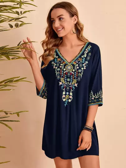 SHEIN V-neck Embroidery Detail Dress - Multicolor - View 1