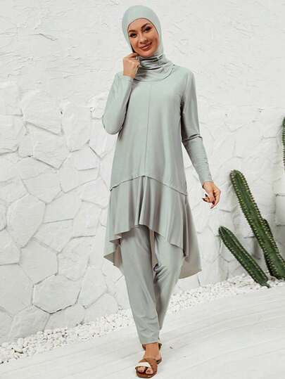 VFJ Women's Casual Crew Neck High-Waisted Burkini Three Pieces Set, Full-Coverage Hooded Swimwear. - Grey - View 1
