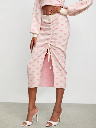 VNCIRCLE Designer Heart Pattern Drawstring Split Thigh Elegant Sweater Skirt, Fall, For Autumn & Winter, Holiday, Party, New Year Eve, - Multicolor - View 1