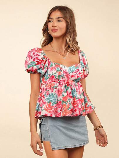 SHEIN VCAY Vacation Floral Print Woven Women's Elegant Vacation Woven Printed Bubble Short-Sleeve Lady Shirt With Sweetheart Neck Blouse, Summer For Women - Pink - View 1