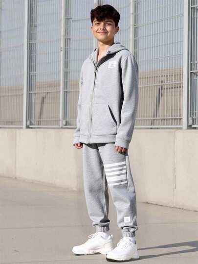 Vacaura 2pcs/Set Tween BoysSpring/Autumn Hooded Zip-Up Jacket And Drawstring Pants Casual Sportswear Outfit - Grey - View 1