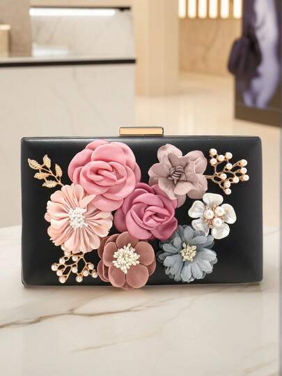 Valentine's Day Gift Heart Floral Women's Evening Clutch Bag, Fashion Cute Girl Lady Handbag With Pearl Rhinestone Glitter, Spring Pink Shoulder Chain Wallet - Black - View 1