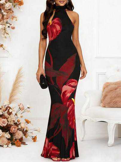 Valentine's Day New Backless Halter Elegant Dress: Red Hibiscus Flower Print, Fitted Backless Design, Sexy & Elegant, Suitable For Valentine's Day, Formal Dinner, Vacation, Cocktail Party, Beach Party, Etc. - Multicolor - View 1
