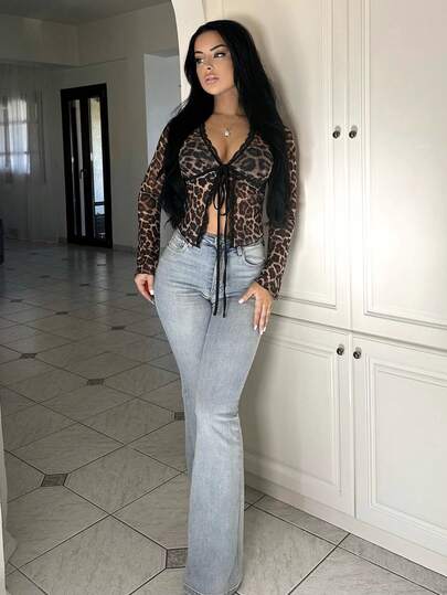 Vassilux Open Front Leopard Print Mesh & Lace Contrast,Ladies Sexy Contrast Lace,Tie Front Flare Sleeve V Neck Regular Fit Brown All Over Print,Animal,Leopard Print,Textured Pattern Women Tops,Spring/Fall,Casual Daily Wear Y2K Outfit  - Brown - View 1