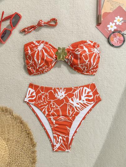 Soleia Women's Leopard Print Metal Decor Front Cutout Tied Back Swimsuit Set, For Vacation Bikini Set Vacation Cute Bikini Set Pattern Bikini Tropical Bikini, Tube Top,Party - Multicolor - View 1