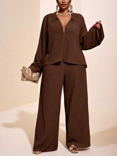 Veslaya 2025 New Spring/Fall Solid Color Jam Color V-Neck Solid Shirt With Flared Sleeves And Wide Leg Pants Set,Fall Clothes For Women - Brown - View 1