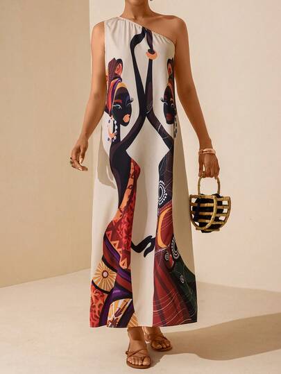 Vesra Printed Maxi One-Shoulder Dress For Women, Vacation - Apricot - View 1