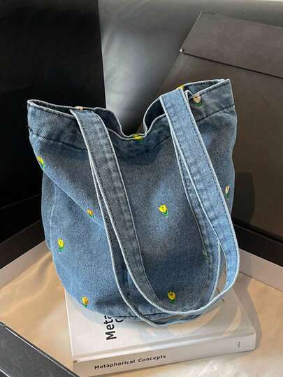 Vintage Denim Floral Embroidery Versatile Shoulder Bag, Student Lunch Bag, Bucket Bag For Women - Baby Blue - View 1