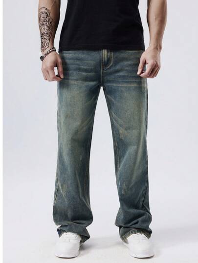 Vintage Elastic Waist Wide Leg Casual Washed Men's Jeans - Dark Wash - View 1