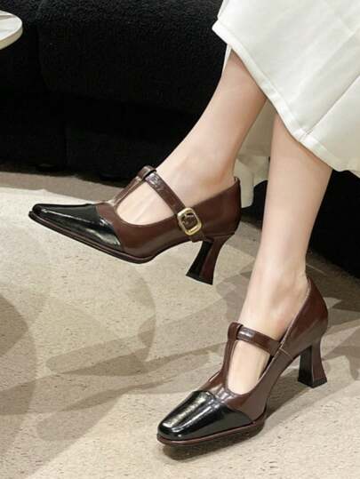 Vintage French Style High Heels For Women, Square Toe Mary Jane Shoes With Buckle Strap, Spring And Autumn New Arrival - Brown - View 1