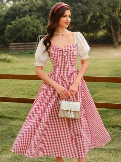 Vintamour Vintage Classic Elegant Floral Print Fitted Patchwork Dress, Plaid Flared Skirt, Red Short Sleeve Dress, Spring/Summer - Red and White - View 1