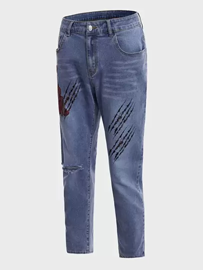 ROMWE MEN WB Horror | ROMWE Guys Figure Graphic Ripped Jeans - Medium Wash - View 5