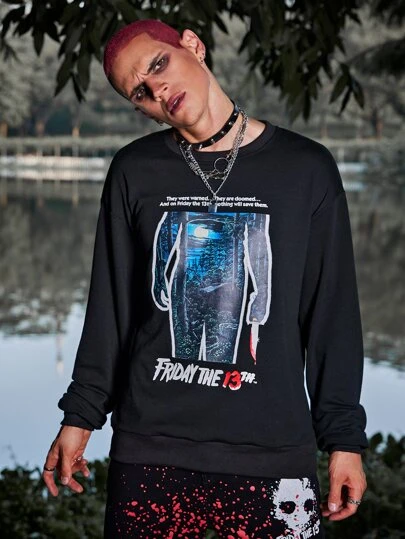ROMWE MEN WB Horror | ROMWE Guys Slogan Figure Graphic Sweatshirt - Black - View 1