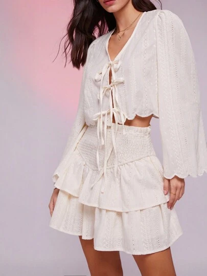 WESTFADE Cowgirl Eyelet Woven Smocked Ruffle Waist Tiered Mini Skirt Spring Break Vacation - Beige - View 1