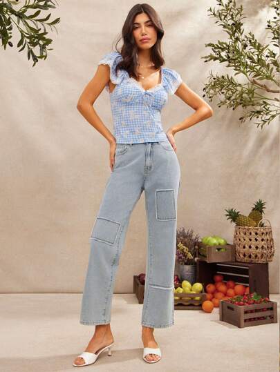 WESTFADE Spring High Rise Western Patchwork Cropped Straight Denim Jean Summer Beach Vacation Brunch Jeans - Light Wash - View 1