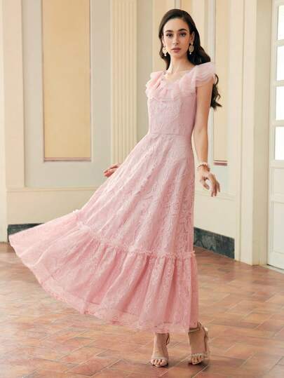 ZEYLAH WOMEN'S Ruffle Trim Lace Tiered Maxi Dress For Valentine's Day,SPRING/SUMMER - Pink - View 1