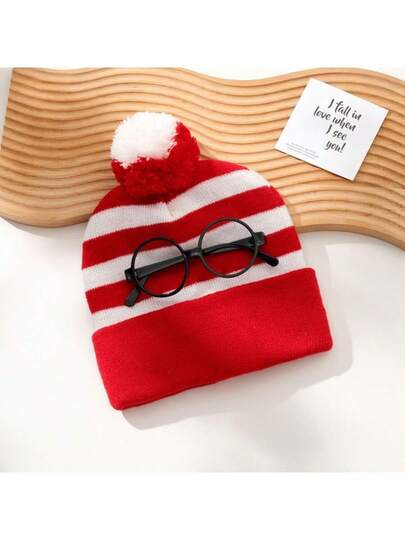 Warm Red And White Where's Wally Waldo Knitted Hat And Lens-Free Glasses Frame Role-Playing, Holiday Party Gift, Winter Men's And Women's Valentine's Day Hat Christmas - Multicolor - View 1