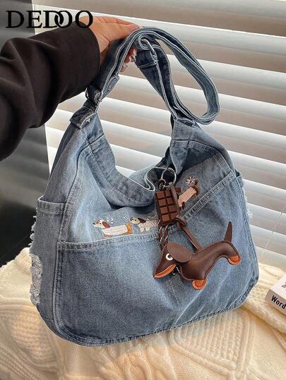 Washed Denim Bag, Large-Capacity Messenger Bag, Student Bag, Female Japanese Canvas Bag, Korean Version Of Simple Shoulder Bag - Dusty Blue - View 1