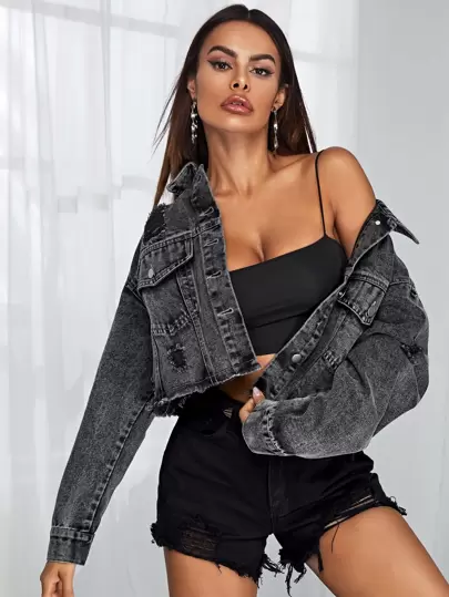 SHEIN Essnce Washed Frayed Hem Ripped Denim Jacket - Grey - View 1