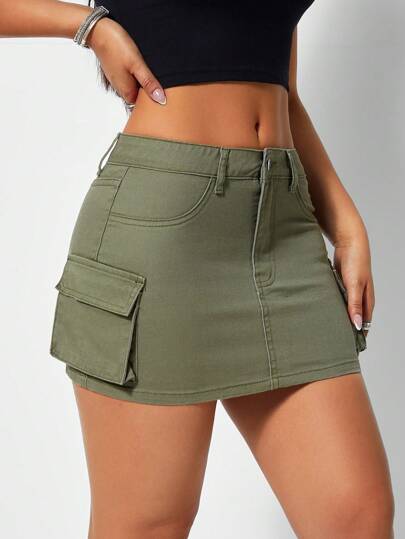SHEIN Tall Washed Women's Denim Mini Skirt - Olive Green - View 1