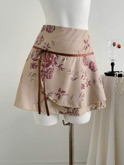 Elamini Vintage Floral Print Tie Front Low Waist Sexy A-Line Ruffled Hem Skirt - Multicolor - View 1