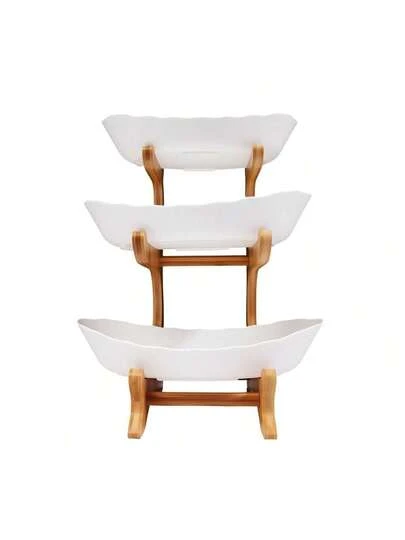 White 3-Tier Plastic Fruit Stand, Bamboo-Style Multi-Level Display Tray For Party Snacks & Dessert Serving With Stable Base - Wood, White - View 3