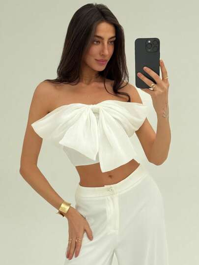 Aloruh White Contrast Fabric Bow Front Bustier Crop Top, Romantic For Wedding And Date - White - View 1