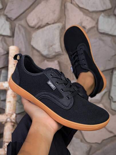 Wide Toe Breathable Mesh Vulcanized Rubber Sole Casual Lace Up Sneakers For Wide Feet, Round Toe Shape, Soft & Comfortable, Hiking, Walking - Black - View 1
