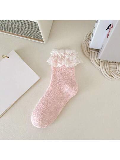 Winter New Arrival Thickened & Warm Coral Fleece Anti-Skid Socks With Lace, Girl Fleece Sleep Socks - Pink - View 1