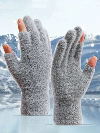 Winter Plush Gloves, Solid Color Two-Finger Cut Breathable Warm Writing Gloves, Touch Screen Soft Knitted Gloves - Multicolor - View 1