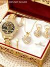 6pcs Gorgeous Luxury Women's Quartz Watch And Silver Jewelry Set (Including A Fully Studded Metal Strap Roman Numeral Dial Quartz Watch, Heart-Shaped Rhinestone Bracelet, Necklace, Earrings, And Ring),
