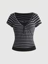 Sweetra French Retro Vertical Stripe Textured Ruffle Splice Wooden Button Petal Sleeve Women Short Sleeve Blouse, Suitable For Spring/Summer Casual And Date Occasions