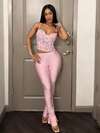 Slaydiva New Elegant Sexy Party Birthday Valentine's Night Club Cocktail Vacation Lace Cup Waist Cincher Camisole Top And Flared Slit Tight Pants 2 Pieces Set - Pink 2 Piece Pants Set Pink Matching Set Pink Birthday Outfit Women Pink 2 Piece Set