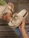Khaki Square Toe Flat Slippers For Women, Metal Leopard Head Buckle Decor, Linen One-Strap Slip-On, Fashionable Beach Sandals, Elegant Casual Versatile Women Flat Slide Sandals, Summer New Arrival